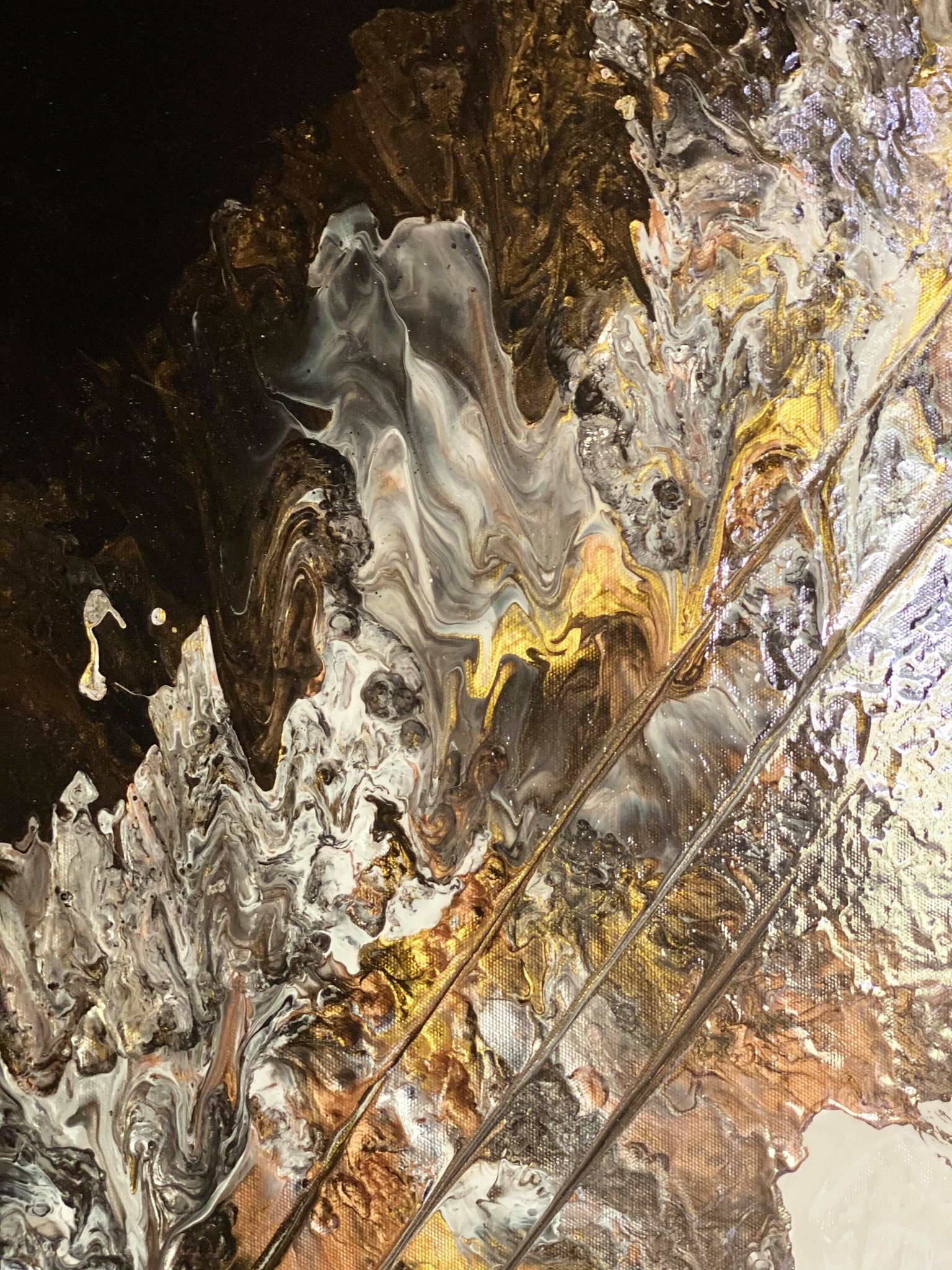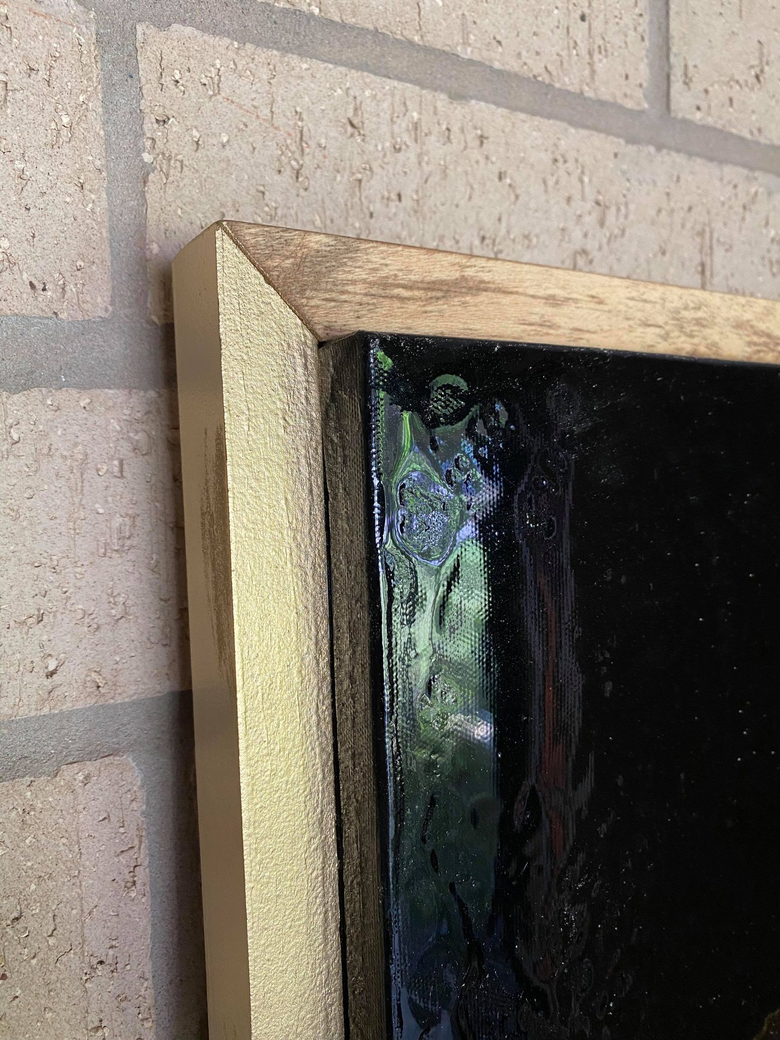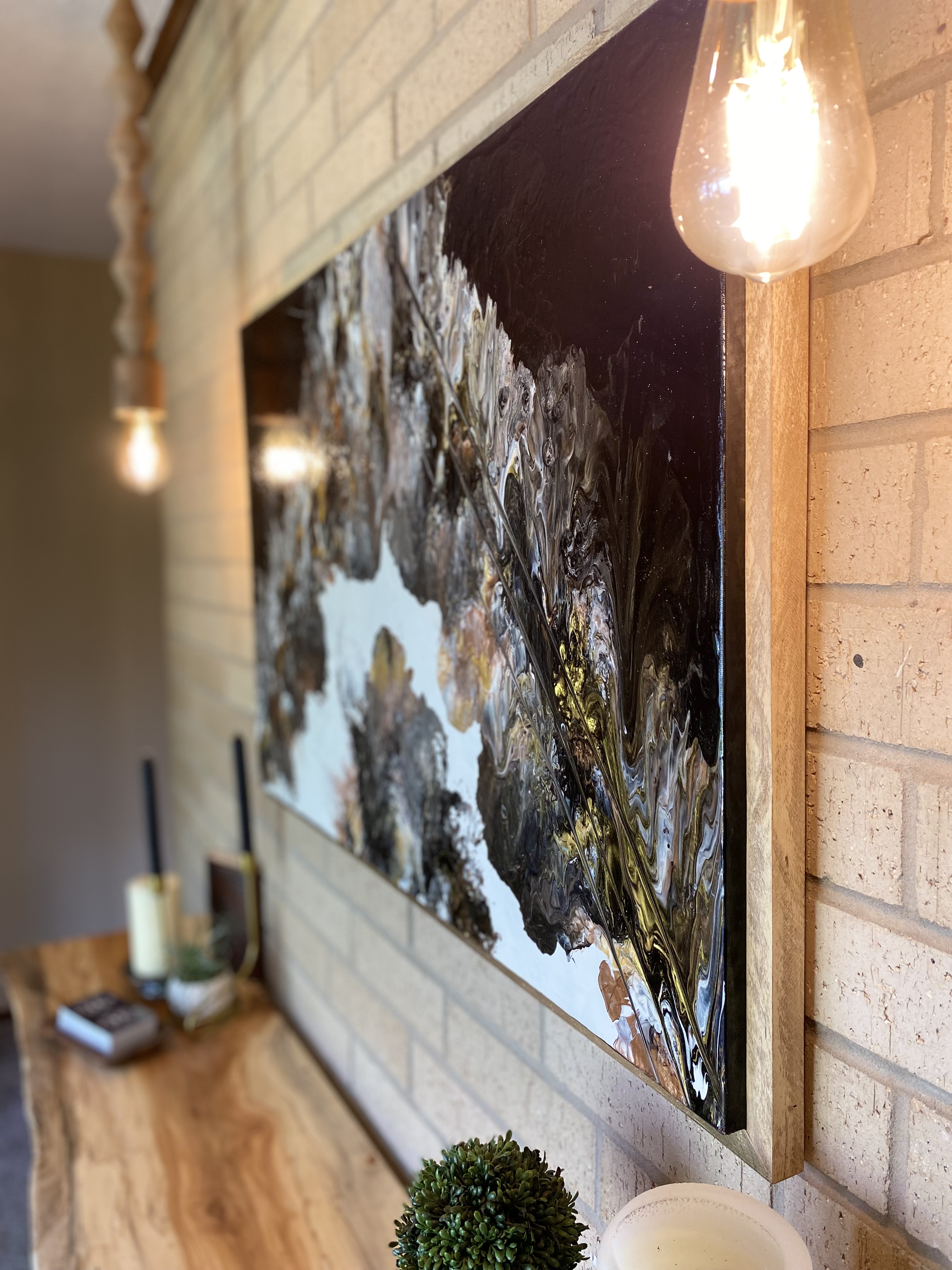 This hand painted art is ready for your home. The perfect size to catch any eye. Marbled metallics in gold, bronze and silver melt into the dramatic black and white. Framed in an edgy half wood half gold frame. Guaranteed to have you day dreaming of marble. Email us for a quote on shipping.