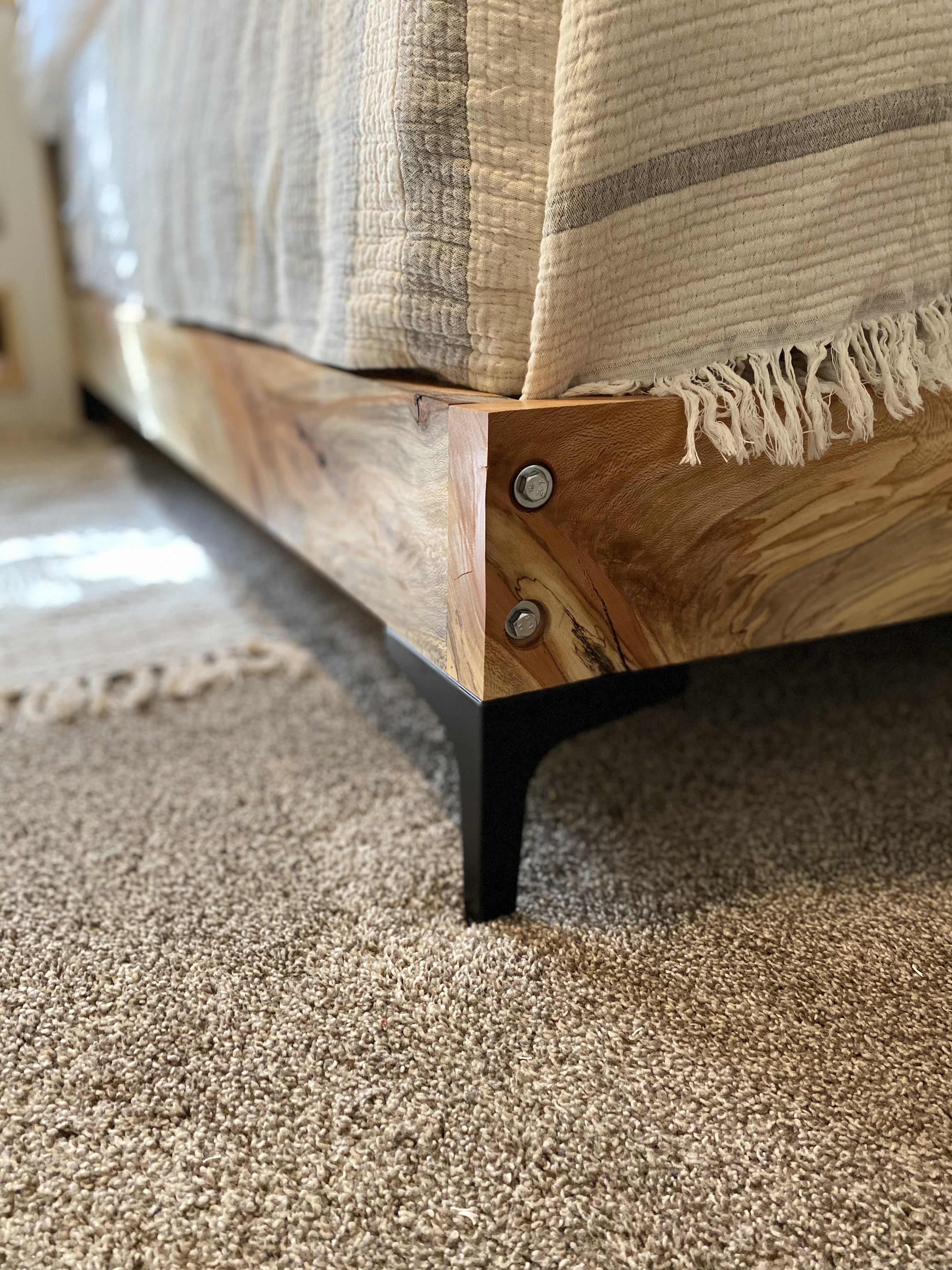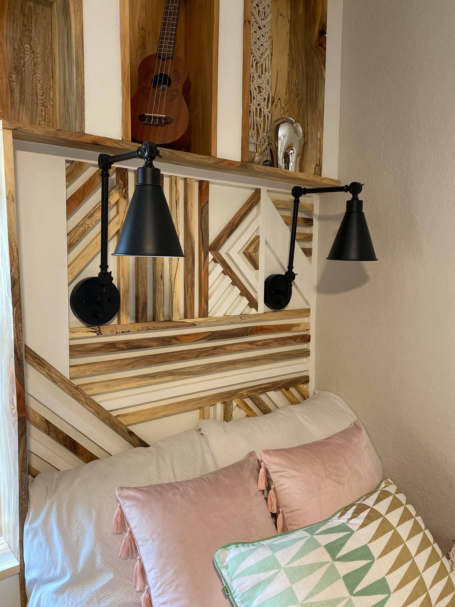 Ever feel like you're staring at a blank wall? This transformation not only gives you something beautiful to look at but it also provides storage. Customize your wall down to every last detail. Choose your wood, paint color and size and shape of the shelving. For this room we even added a built in headboard and lighting, creating the perfect place to relax. This wall would also be perfect for an office with a built in desk. Email us today for a quote on your wall transformation.